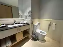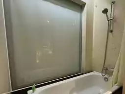 - Toilet has bathtub but no separate shower area. Worse is the design of the tub. Water from bathing is collected on the side and will eventually flow to the toilet floor and flood the toilet. No way to prevent that.