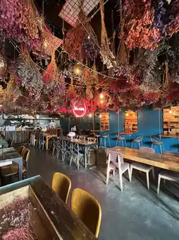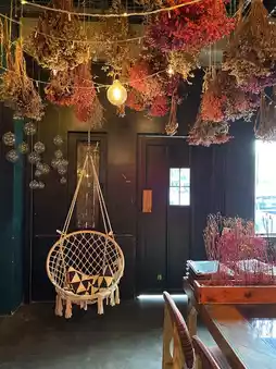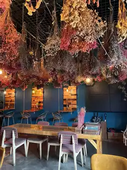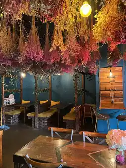 Opposed to the muted cold black color exterior, you’ll find a whimsical, floral atmosphere once you open this bistro’s door. Greeted by the dimly lit teal walls and dried flowers hanging from the ceiling, complete with swing tables and floral arrangements at every corner, it's hard not to love this place. Besides pretty aesthetics, they serve mean brunch too!
