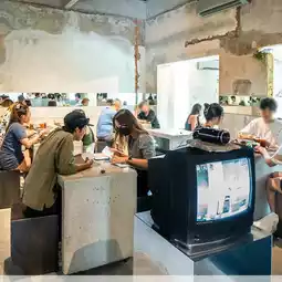 This unique cafe boasts a fully concrete exterior, which follows through inside with its consistently minimal furnishings: think concrete walls, tables, and seats. The cafe space has a rough and unfinished look, complete with elements that add to the hipster, art gallery vibes.