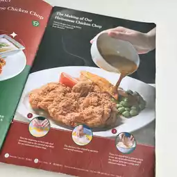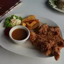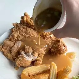 đŊī¸ Hainanese Chicken Chop, a huge piece of fried chicken, served with the restaurant's special gravy sauce and French fries. The plate is very big. I can tell you that you will be full for sure.