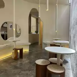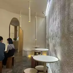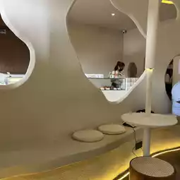 The cafe's facade is very cute and unique. upon entering the interior also follows the facade with its playful and curvy design.