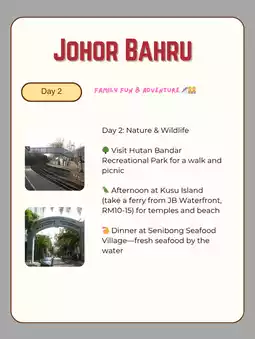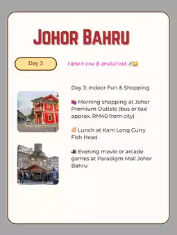 • 🛍️ Morning shopping at Johor Premium Outlets (bus or taxi approx. RM40 from city)