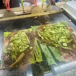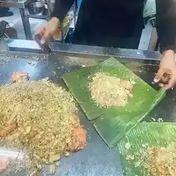 😋 A plate of seafood fried rice with a large portion of rice and seafood (squid, prawn & some do have clams). The highlight is the way the meal is cooked! and the way it is served-on a banana leaf!