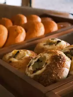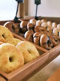 You'll find a variety of bagels in flavors like garlic, soboro, and butter, as well as unique options like blueberry and Dubai chocolate. They also have sandwiches, making them a great brunch option.