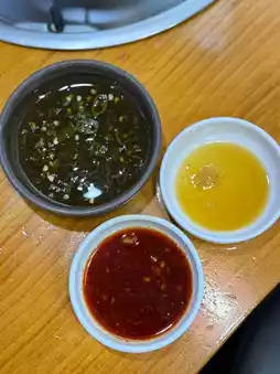 The accompanying seasoning sauce, pickled green onions, and garlic sauce make