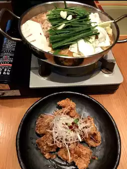 The good thing about dinner is that the menu is rich, with motsunabe in a hot pot, fried mentaiko, and mentaiko tamagoyaki.