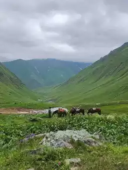 💚 Stunning views filled with green meadows, streams, flowers, and towering mountains. Perfect for beginners as the trail is not too steep. The horses are quite tame, and there is a guide to assist throughout the journey.