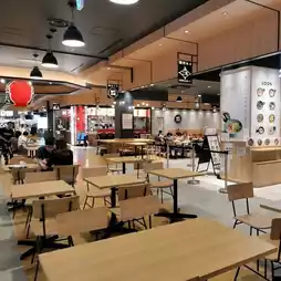 There are tables and chairs lined up along the aisles, so you can eat at your leisure✨