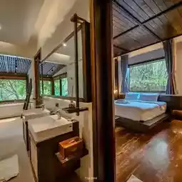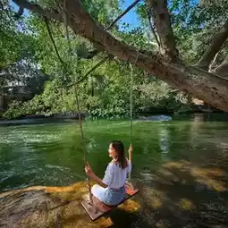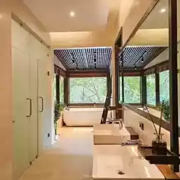 And the highlight corner is the natural pool. It's a bathtub outside the house. Soak and feel cool and refreshed. It's like playing in the river. And still surrounded by nature, you can enjoy the river view.