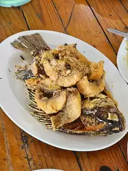 The menu here offers a wide variety of dishes, but the highlight is the fish dishes. They use fresh fish from the dam, with many types to choose from. Today, we tried the fried Nile tilapia with garlic, and it was incredibly fresh and delicious! Other dishes are equally tasty. We highly recommend you stop by and give it a try.
