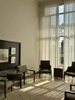 Next to the lobby, there's a café and bar where you can enjoy light refreshments and take a moment to relax. The garden view beyond the coffee cup adds a warm touch to the moment. ☕🌿🪟