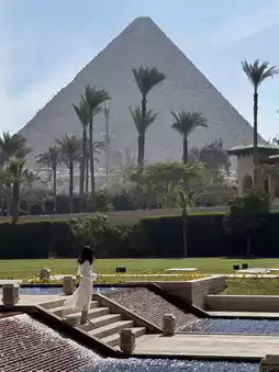 As you stroll through the hotel gardens, the pyramids peek out from between the palm trees. The deep green contrasts with the sand, creating a landscape where long history coexists with the freshness of summer. 🌴🏛️☀️
