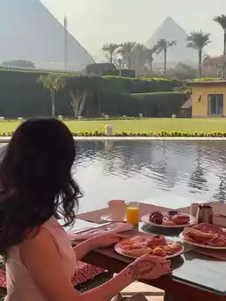 The breakfast restaurant offers a dining experience with a stunning view of the pyramids right before your eyes. Warm bread, fresh fruits, and aromatic coffee blend perfectly with the morning sunlight, making the start of your day even more delightful. Sipping coffee while gazing at the ancient scenery, you'll understand why this place is called the 'hotel of dreams.' ☕🍞🌅