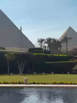 The garden paths spread throughout the hotel are adorned with palm trees and flowers, creating a picturesque garden scene. A walk with the Pyramids as a backdrop deepens the emotional impact of your trip to Egypt. During the day, the sunlight is warm, and in the evening, the sky turns a romantic shade of red. ๐ด๐ธ๐