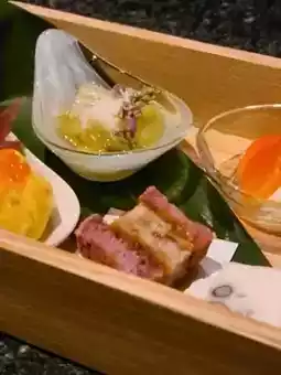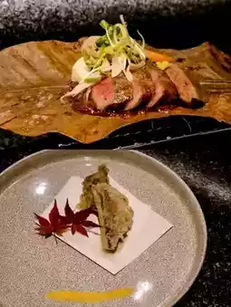 •Japanese black beef and autumn vegetables grilled on a hoba leaf with miso-based sauce