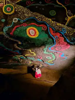 Artist Sadayuki Hagiwara's modern art murals, themed on a dialogue with the sun, moon, stars, and nature, create a mystical space. Visitors are enveloped in a ritual-like atmosphere.