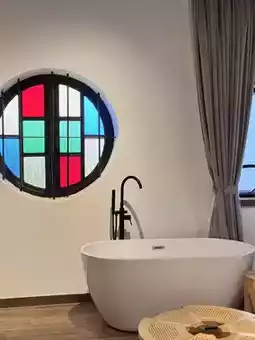 🛁 Thoughtful Guest Rooms: The bathtub in front of the round stained-glass window sets the perfect mood for a relaxing soak. Every detail reflects the owner’s creativity, making it an unforgettable stay💖