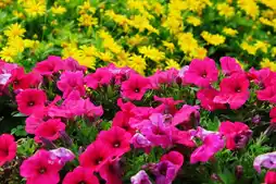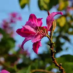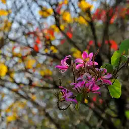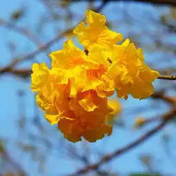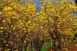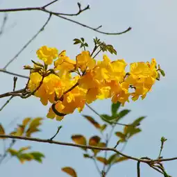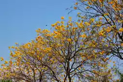 A morning stroll along the park's greenway reveals blooming yellow tabebuia and a variety of other plants and flowers. The sounds of birdsong and the vibrant colors create a cheerful atmosphere, with the Phoenix Tower visible in the background.