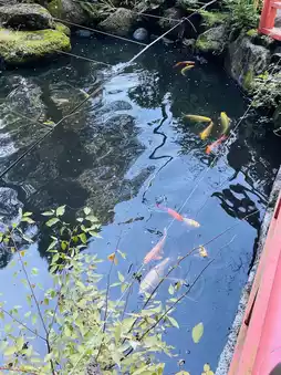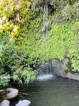 On the left, a 3m high waterfall called Ichijo Falls cascades powerfully into a pond, with koi carp swimming gracefully in the water.