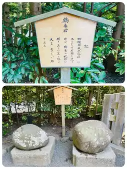 There are also two stones nearby called "Tsurukame Ishi" (crane and turtle stones). It is said that when washed with water, a crane and turtle pattern appears on these stones, which are considered to be auspicious.