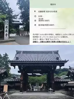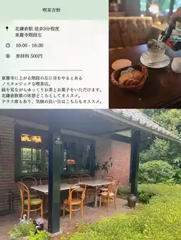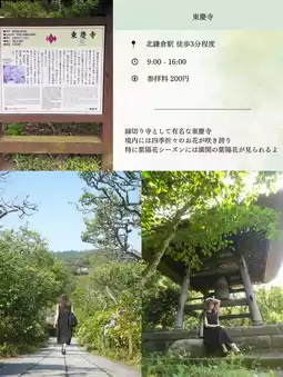 ▶︎Kita Kamakura Model Plan━━━━━━━━━━━━━━━Kita Kamakura Station ↓1 minute walk↓Engakuji Temple ↓3 minutes walk↓Tokeiji Temple (Rinzai sect, Engakuji school, Matsuokayama, Tokei Soji Zenji) Cafe Yoshino ↓15 minutes walk↓Kenchoji Temple Dim Shin An ↓5 minutes walk↓Enma-sama's temple En'o-ji Temple (Rinzai sect, Kenchoji school, Niiyama, En'o-ji) ↓15 minutes walk↓VERVE COFFEE ROASTERS KITAKAMAKURA ↓5 minutes walk↓Kita Kamakura Station━━━━━━━━━━━━━━━━━━━━━━━1 Engakuji Temple 🕛8:30 - 16:30 💰 Admission fee: 500 yen... You can also try copying sutras for 1,000 yen! 2 Tokeiji Temple 🕛9:00 - 16:00 ... Tokeiji Temple, famous for being the temple of severing ties (as of 2023, photography is prohibited on the premises)
