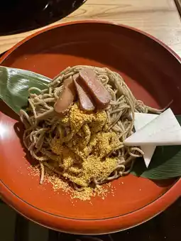 Tsuki to Matsu is famous for its Karasumi soba. It is a luxurious dining experience in a traditional Japanese house. The Karasumi is flavorful and incredibly delicious. It is said to be produced on Boze Island in Hyogo Prefecture. The staff were very friendly and the soba course was absolutely delicious.