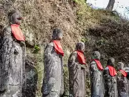 Six Jizo statues are lined up at the temple entrance. Looking closely, you'll notice that the one on the far left has a high nose. 😳