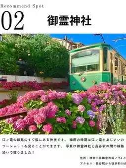 ②Goryo Shrine This shrine is located right next to the Enoshima Electric Railway tracks. During the rainy season, you can see a photo of the Enoshima Electric Railway and hydrangeas together. The photo was taken along the tracks between Goryo Shrine and Hase Station!