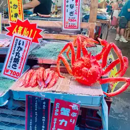 Less than a 5-minute walk brings you to Komachi-dori, where the food is high-quality and diverse, including seafood skewers, strawberry daifuku, and shaobing (steamed buns). Besides enjoying the street food, try their signature fish and seafood donburi. 🦐🦀🐟