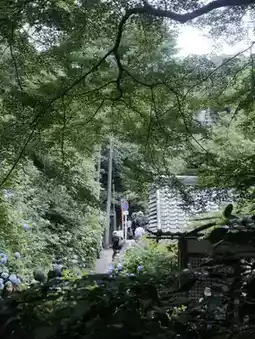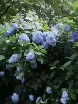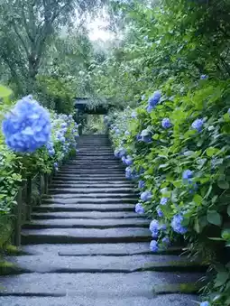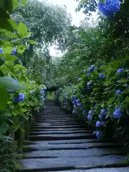 Over 80% of the hydrangeas in the temple are the native 'Hime Ajisai' variety, primarily in blue and purple hues. The color of hydrangea flowers changes with the pH level of the soil: acidic soil produces sky blue flowers, neutral soil yields milky white flowers, and alkaline soil results in red or purple flowers. A must-see is the approach to the temple gate, lined with blooming hydrangeas on both sides.