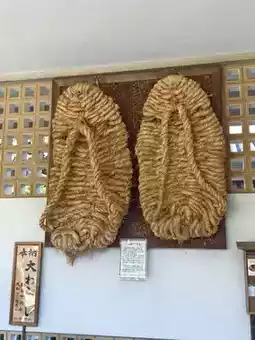 Next to the Buddha hangs a pair of straw sandals that are 1.8 meters long and weigh 45 kg. The straw sandals were woven by a group of children in 1951. They hope that the Buddha can wear straw sandals and walk on every inch of Japanese land. The straw sandals are now made and replaced every three years by the same group of children.