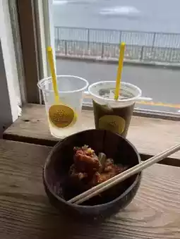 I ordered a lemonade soda and it was okay, but I also ordered an iced black tea, which had a strange taste. It was sweet and dark, and had shredded coconut in it, so I couldn't finish it. The fried chicken was also okay, freshly fried and hot. I felt like ordering the chicken was a better value than ordering the drinks. 😂 Overall, it was okay. I really enjoyed the view from the window. 🤍