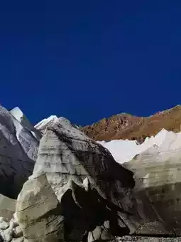 Glacier No. 58, also known as Qudennima Glacier, has an altitude of 5,180 meters. (In fact, Glacier 58 is only a small part of the Qudennima Glacier.) Because it is located on Boundary Marker No. 58 at the junction of China and India, it is called Glacier No. 58 by hikers. It has been listed as a restricted area and tourists are not allowed to enter. This glacier is located in Gangba County, Shigatse Prefecture, Tibet, more than 40 kilometers away from the county seat. However, due to its low popularity, few outsiders know about it, and even map navigation will lead to the wrong location. We originally planned to stay in a temple near the glacier, but the thin air made us feel very uncomfortable, so we went down to the county town that night and climbed up again early the next morning. You can drive a car to a small ice lake, and then walk in. It takes about 20 minutes to reach the edge of the glacier, which is quite shocking. There is no one else but our team.