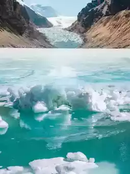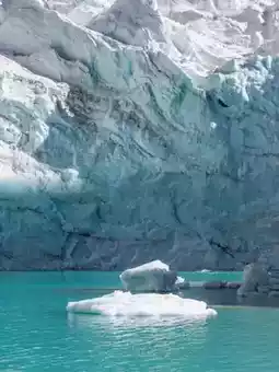 In front of the glacier lies a blue moraine lake as clear as a mirror