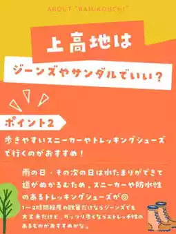 ☞ On rainy days and the day after, puddles will form and the roads will become muddy, so sneakers or waterproof trekking shoes are recommended.