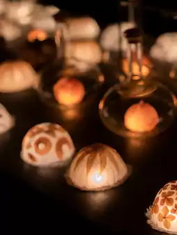 The owner, Saida-san, is the founder of "peel art," a creative art form that uses fruit and vegetable peels and eggshells as its main materials.