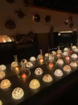 There are about 10.000 Dandelion fluffs and peel art. When u entered this place it feels so mysterious but fantastic feeling. They reuse thing that we usually thrown away, and there are some chicken that they have in the gallery. This place are interesting to visit.
