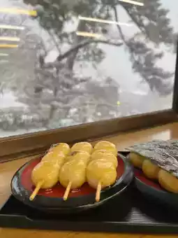 It was cold, so I stopped at a rest area on the way and warmed myself up with some rice dumplings and sweet sake ♨️