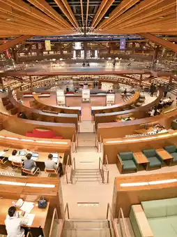 * The spectacular "forest of books": The huge bookshelves arranged in a circle in the atrium space truly resemble a "forest of books." 🌳