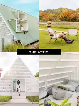 A pastel-colored Nordic-style cafe with a white triangle and an A-frame roof