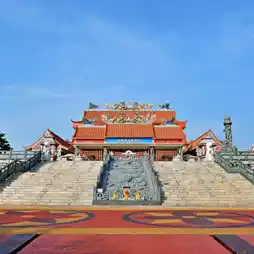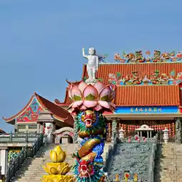The surrounding area has beautiful Chinese architectural structures, including a Buddha statue in the birth posture, a lion statue in front of the stairs leading up to the temple. The middle of the stairs is a stucco carved with a dragon pattern, resembling the path of the gods. In front of the main temple, there is a statue of Chai Xing Ye (this is the statue for money), and Tai Sui Ye (this is the statue for destiny).