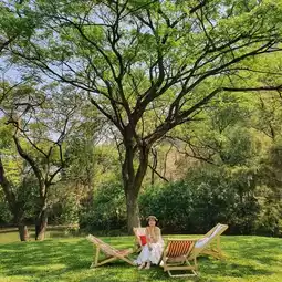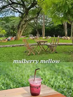 Shop Atmosphere: Mulberry Mellow is a cafe in the middle of nature that provides a relaxed atmosphere, perfect for a relaxing holiday. The seating area is arranged in the middle of a garden with a lush green lawn and large trees providing shade, along with colorful beach chairs that are perfectly arranged. It is perfect for taking pictures or just sitting and sipping a drink. It is a place that meets the needs of both relaxation and taking beautiful pictures for teenagers and families.