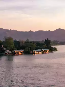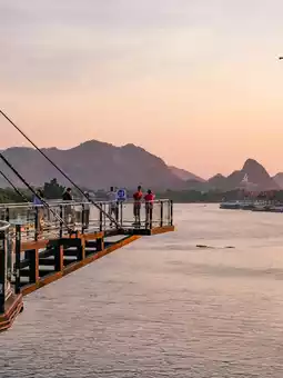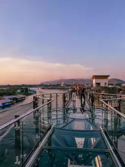 Skywalk Kanchanaburi is a landmark of Kanchanaburi located on the banks of the Kwai River. The view from the top is very beautiful. You can see the curve of the river, the mountains and the city of Kanchanaburi as far as the eye can see. It is a long skywalk along the banks of the Kwai River.