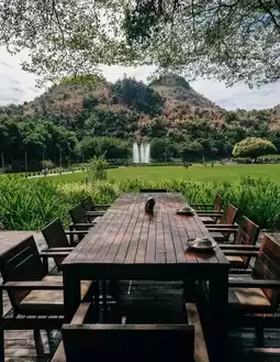 With a panoramic green mountain atmosphere, the large restaurant has both indoor air-conditioned and outdoor seating areas, open with fans and under the shade of large trees. The spacious area allows you to walk on the lawn with a long walkway to a large lake and a mountain view as a backdrop. Just sitting and eating makes you feel healed and relaxed. The menu here is diverse, mostly Thai dishes. The dishes are quite large, everything tastes good and delicious. The service is good and thorough, and the wait time for food is not too long. After finishing the main course, you can continue to the restaurant's cafe.