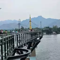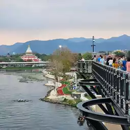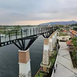 ⛳️A great landmark, enjoy the beautiful evening view at the Kanchanaburi Skywalk. Tourists can go up to see the two-colored river, the Kwai Yai River and the Kwai Noi River, flowing together, and see a 360-degree view of Kanchanaburi.