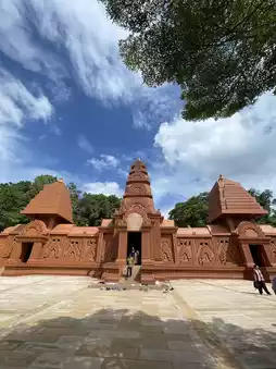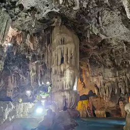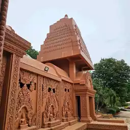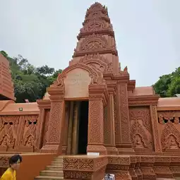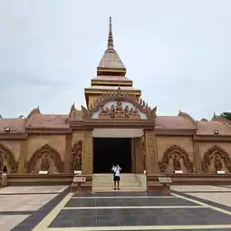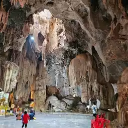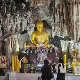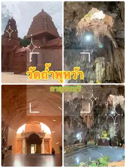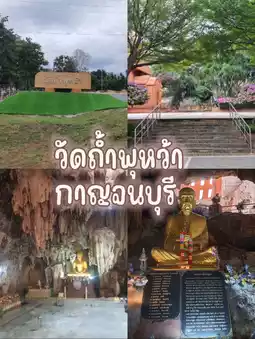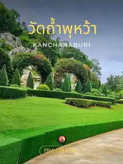 Wat Tham Phu Wa, Kanchanaburi is a temple outside the city, located on the edge of a mountain. It is a temple with a large cave hall. In front of the cave is a large ancient Khmer sandstone castle in brown and red. It is large and has beautiful patterns. The surrounding atmosphere is surrounded by mountains and flowers. It is shady and clean. When walking into the cave, there are beautiful stalactites and stalagmites. The inside of the cave is quite clean. The floor is covered with marble tiles. It is well maintained and has good ventilation. During holidays, there are many Thai and foreign tourists and pilgrims. There is also a large area outside. It can park thousands of cars. The temple is also suitable for meditation and outdoor activities. It can accommodate more than 300-500 people.