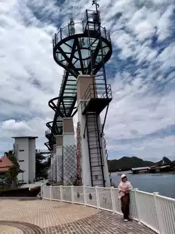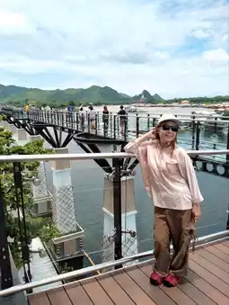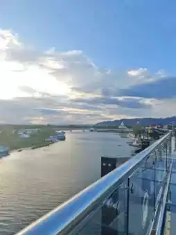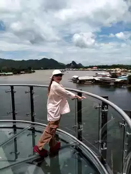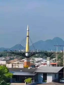 🐻 Hello, today I will take you to visit the skywalk in Kanchanaburi. This place has been open for a short time and is very beautiful. The sky walk here is next to the Kwai River. We can walk up to see the beauty from a high angle of the skywalk. The view is very beautiful. There is no admission fee. It is open every day. The bottom of the sky walk is also beautiful. There are many photo spots. Come and visit.