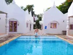 🏊 Plus, there's a swimming pool available for use all day, from morning to evening. Additionally, there's a large lawn for activities, a restaurant, and a café ready to serve delicious meals and beverages to complete your experience.