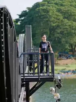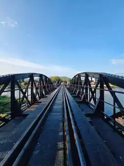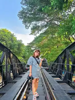 A classic landmark that anyone visiting Kanchanaburi must stop by! 🌞 The black steel bridge stretches across the River Kwai, offering a wonderful atmosphere that combines history and nature in one place. 🏞️