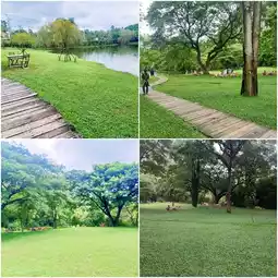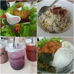 The cafe is divided into two zones: the food court and cafe, decorated in a cute and chic style, offering delicious food and delicious cakes. The beverage selection is both blended and non-blended. The outdoor zone features a large garden lined with large trees, including a large rain tree, and a small river. There are chairs for relaxing and enjoying the atmosphere. You can bring your drinks and enjoy them, and there are plenty of photo opportunities. Perfect for nature lovers.